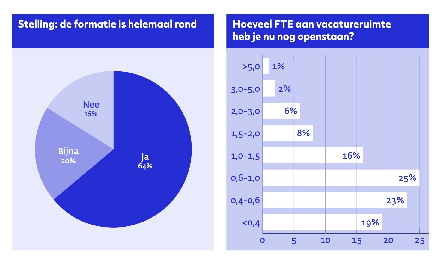 Van de schooldirecteuren met vacatures zegt 25 procent tussen de 0,6 en 1,0 FTE aan vacatureruimte open te hebben staan. 23 procent zoekt personeel voor 0,4 tot 0,6 FTE, 16 procent voor 1,0 tot 1,5 FTE en 19 procent voor minder dan 0,4 FTE. Er zijn met name tekorten onder leerkrachten in het basisonderwijs (56 procent van de openstaande vacatures), alsook onder het ondersteunend personeel, vakdocenten bewegingsonderwijs en leerkrachten in het speciaal basisonderwijs.